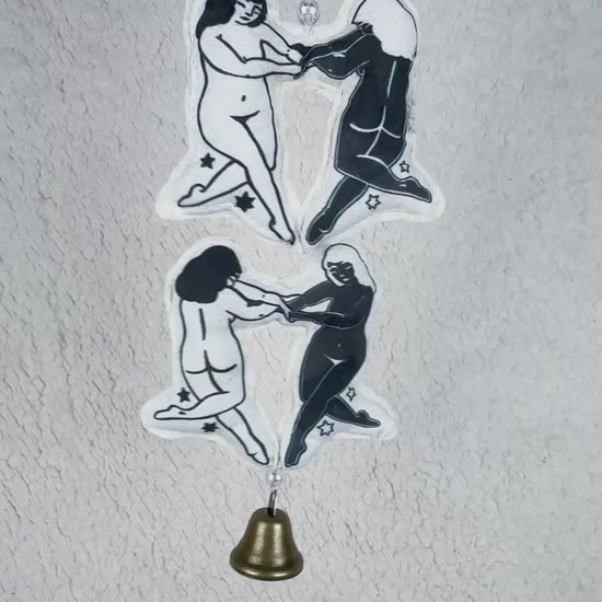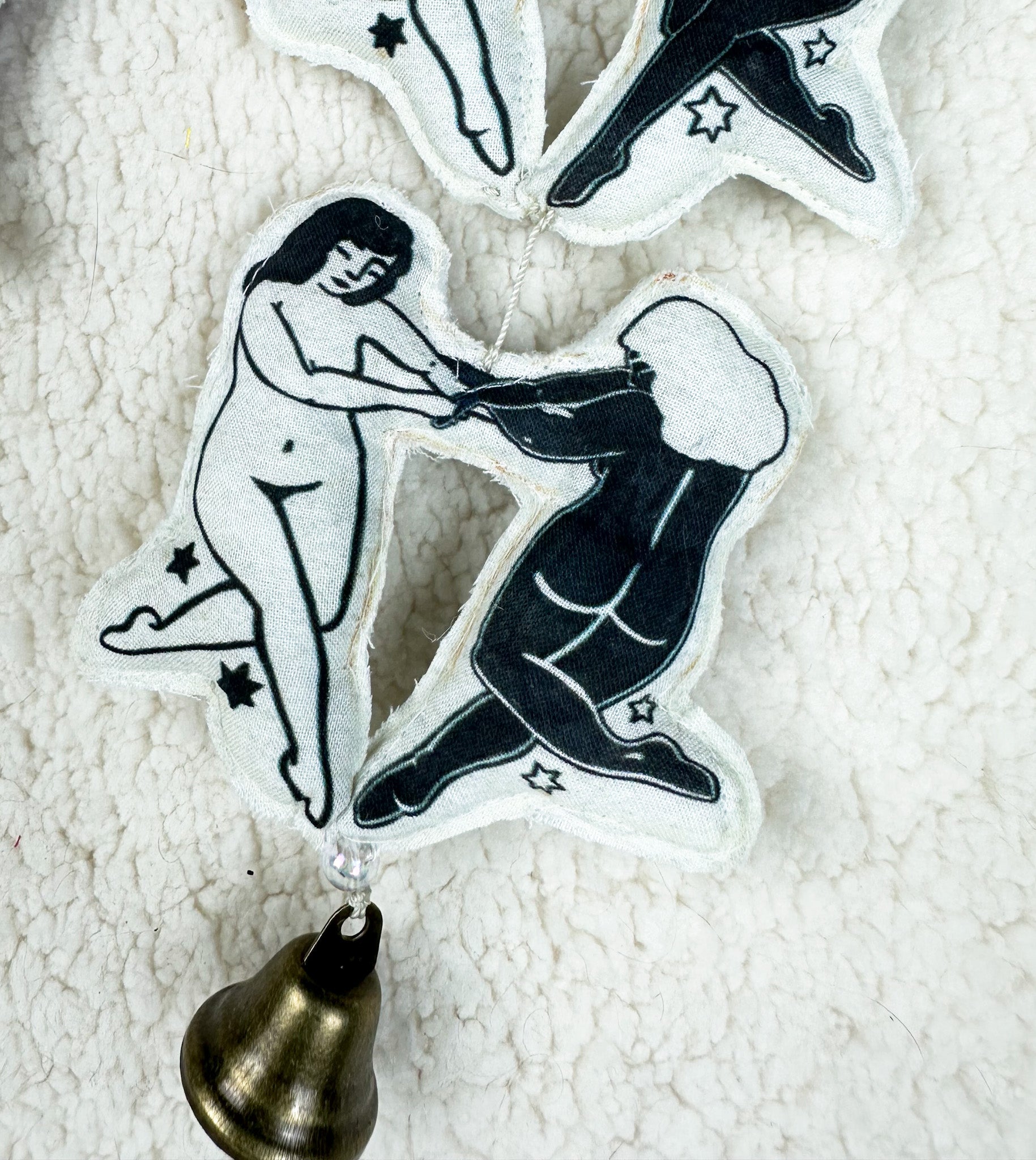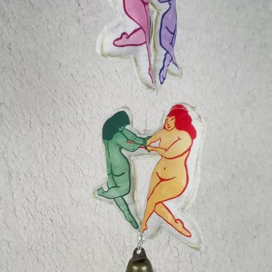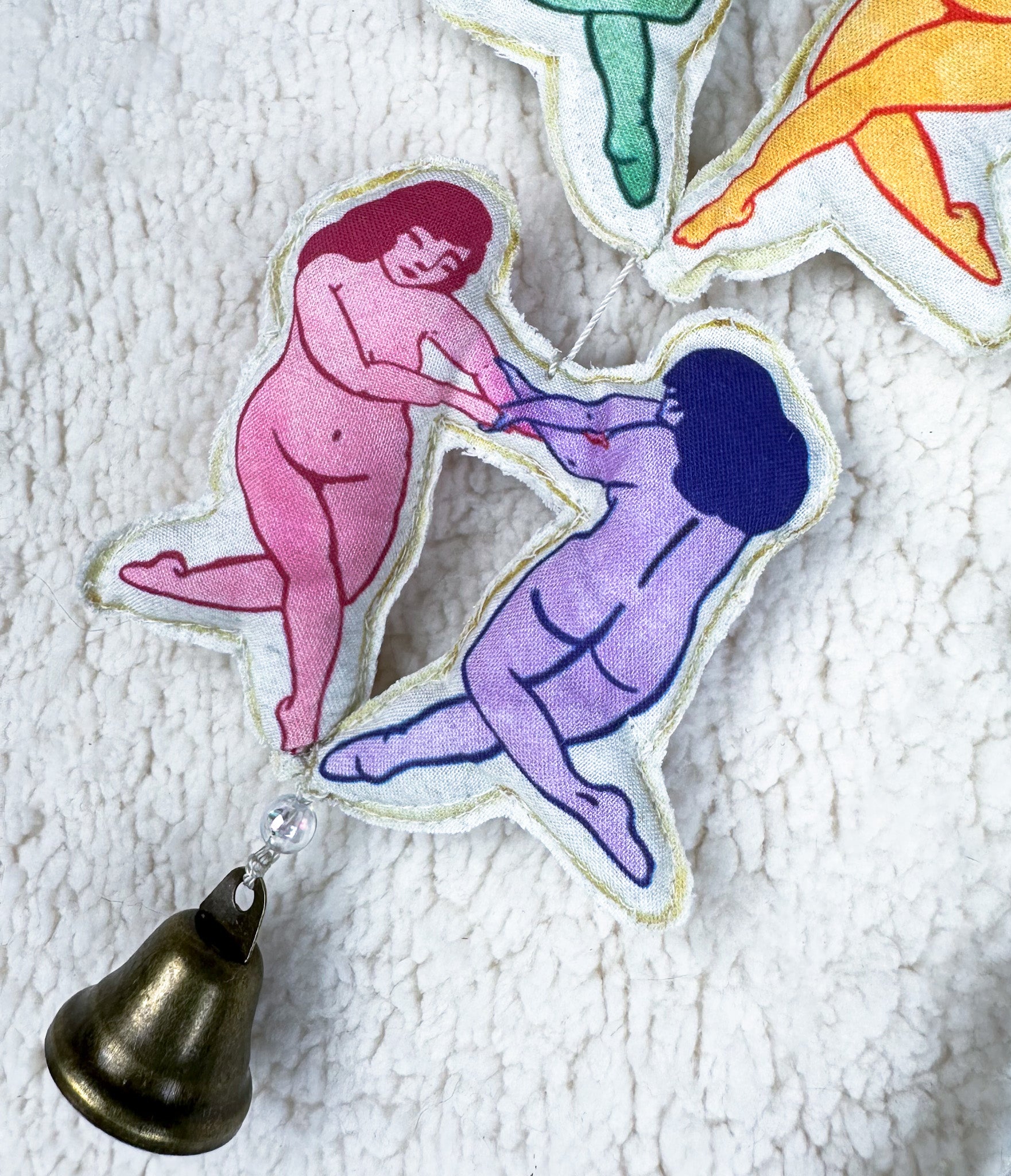 Each lady chain charm is hand-sewn with printed cotton poplin, which features a double sided design. Each stuffed fabric piece is then strung together and finished with opalescent beads and a brass bell. The nude lady print is a reproduction of original drawings by Irene Mudd.