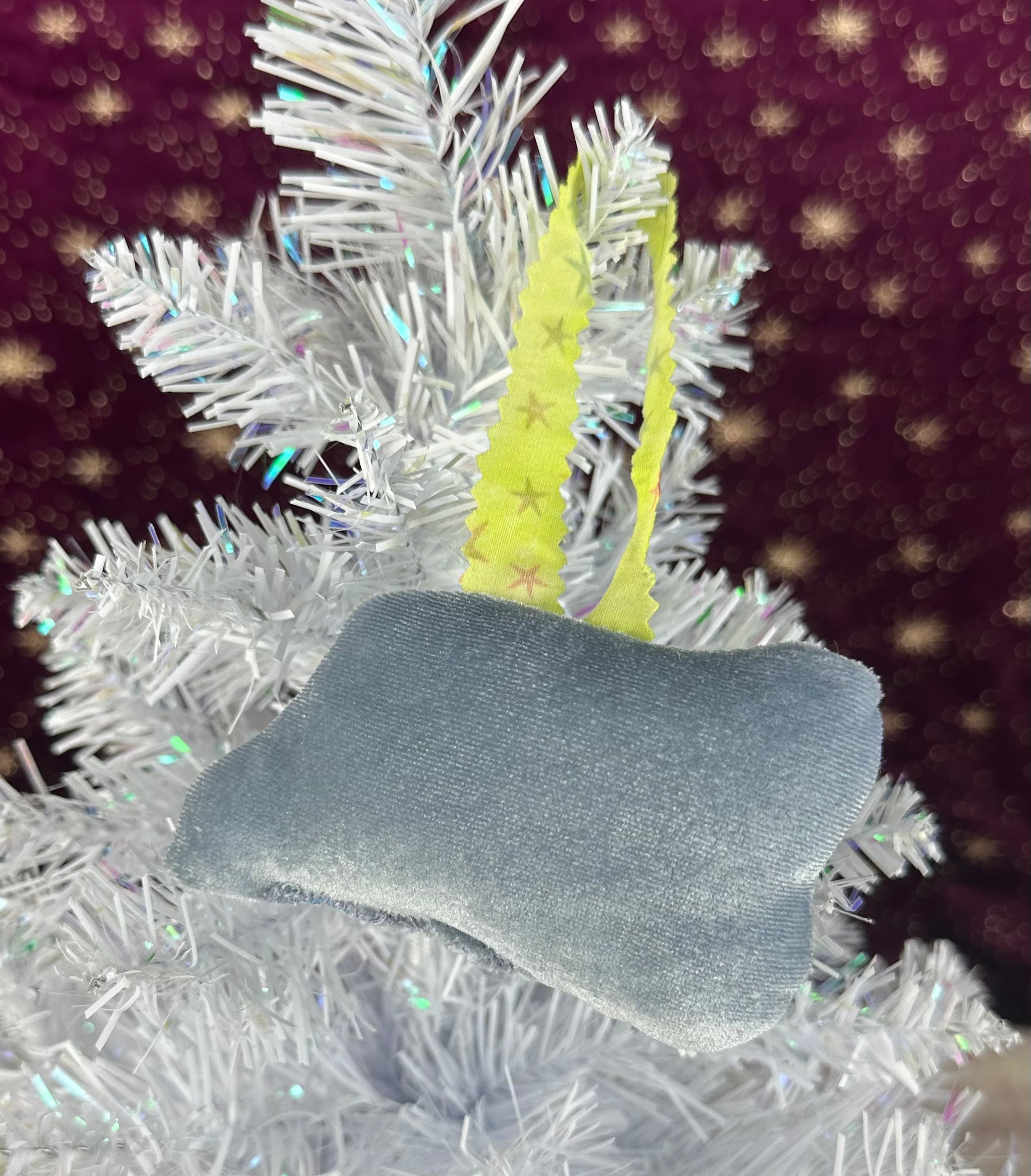 There may be some variation of hanging ribbon type from what is pictured. I use fabric scraps I have on hand, making certain styles/colors limited.