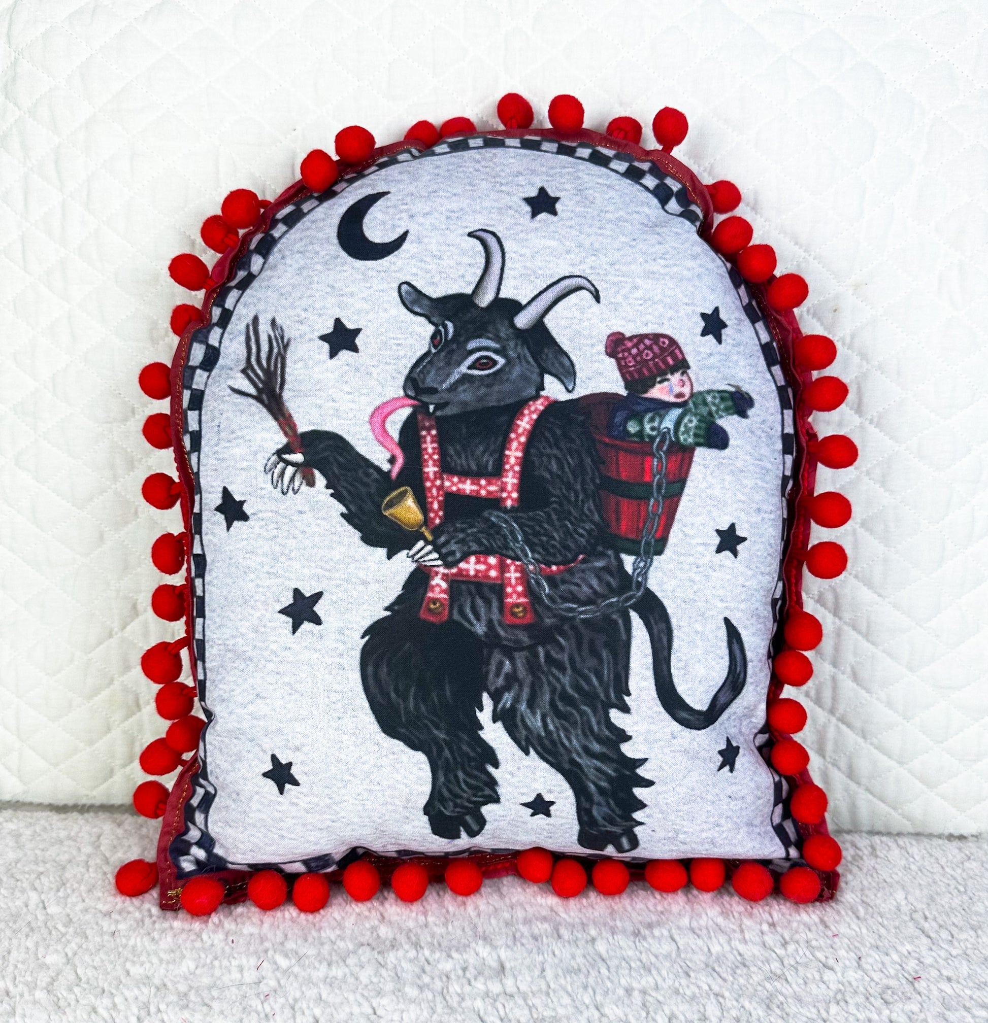 Snuggle up with everyone’s favorite Christmas devil, Krampus! This hand-sewn throw pillow features an original Krampus illustration by Irene Mudd, printed on cotton poplin. The pillow is finished with a red pompom trim and backing fabric*, and reinforced with a hidden canvas shell.