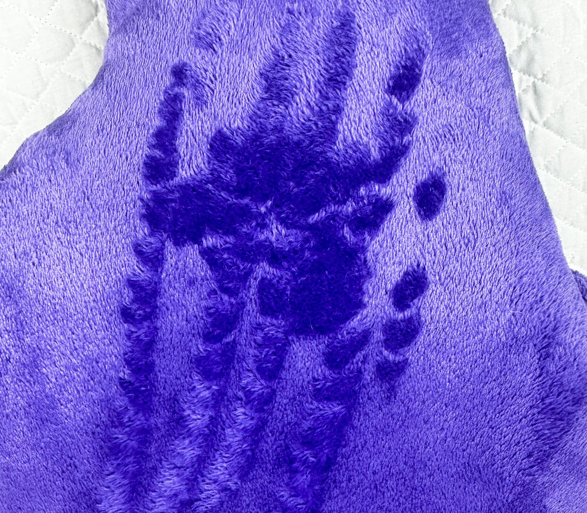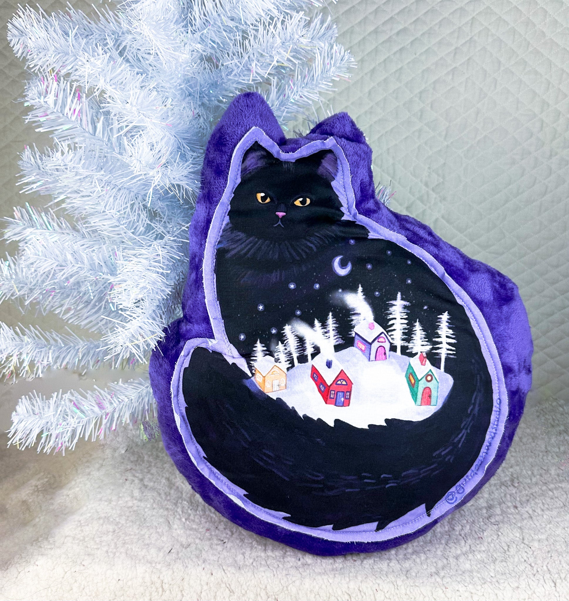Add some fiendish Yuletide fun to your couch with a Yule Cat throw pillow! This hand-sewn pillow captures the silhouette of the giant black Yule Cat, lurking in a snowy mountain village. The pillow features an original Yule Cat illustration, printed on cotton poplin and mounted on felt, and appliquéd to a plush purple pillow form.