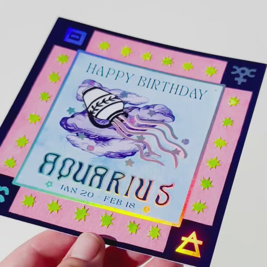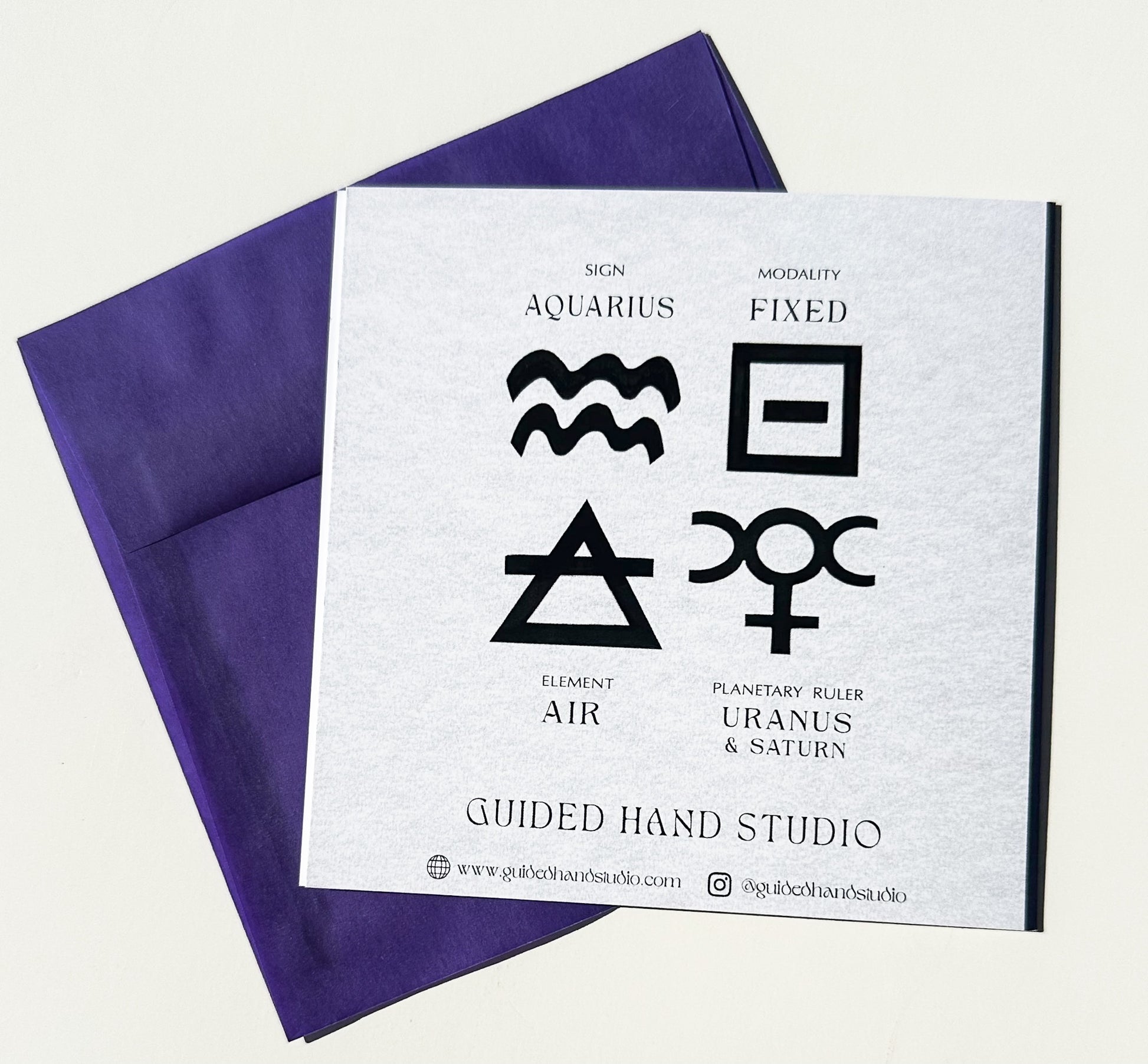These 5x5” folded birthday cards feature vibrant original cut paper artwork by Irene Mudd. The iridescent foil details create dazzling prismatic effects, and on the print’s back is a codex for the symbols unique to the zodiac sign.