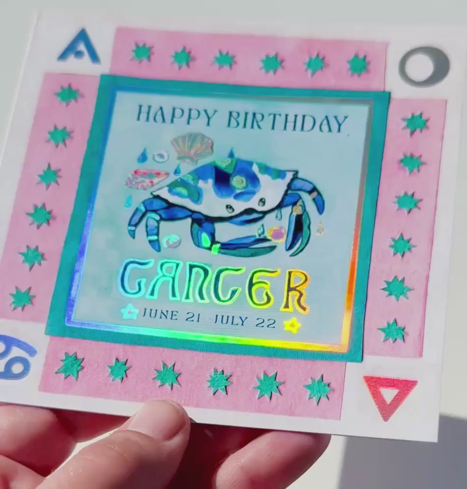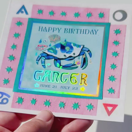 These 5x5” folded birthday cards feature vibrant original cut paper artwork by Irene Mudd. The iridescent foil details create dazzling prismatic effects, and on the print’s back is a codex for the symbols unique to the zodiac sign.