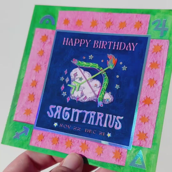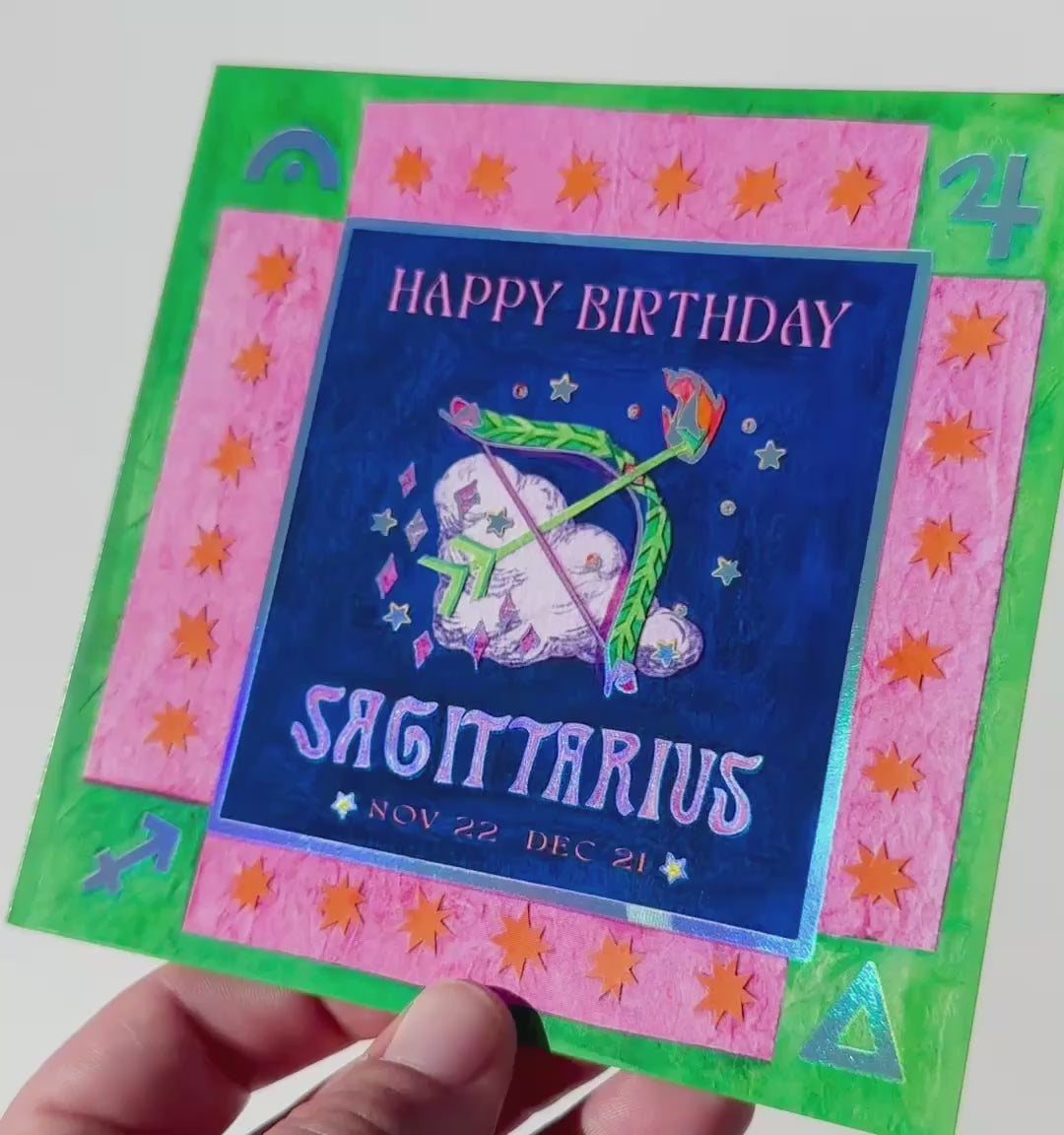 These 5x5” folded birthday cards feature vibrant original cut paper artwork by Irene Mudd. The iridescent foil details create dazzling prismatic effects, and on the print’s back is a codex for the symbols unique to the zodiac sign.
